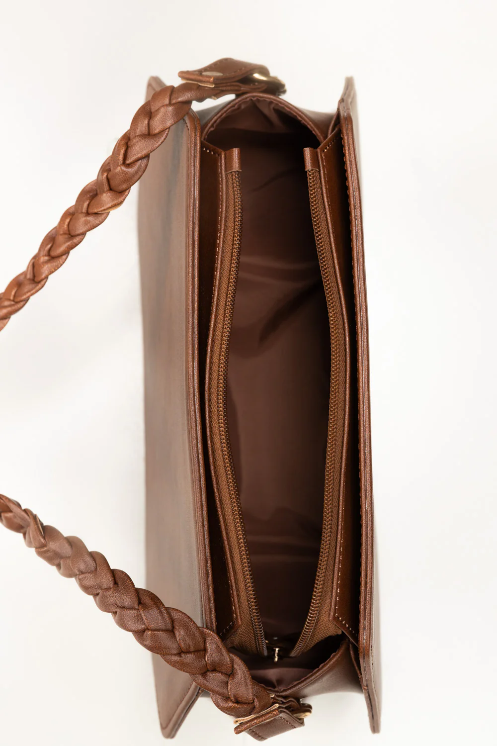 A contemporary statement bag crafted from faux leather, featuring a distinctive geometric silhouette and a braided top handle with sleek hardware. Designed to balance structure and space, it offers a polished yet versatile look that transitions effortlessly from everyday wear to semi-formal occasions.